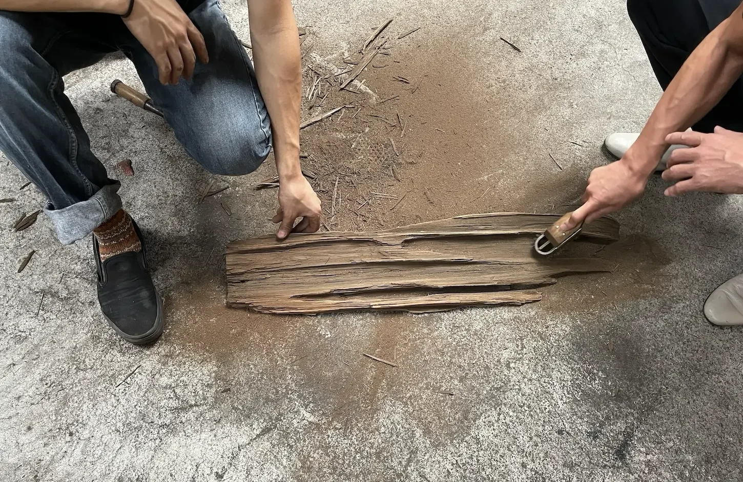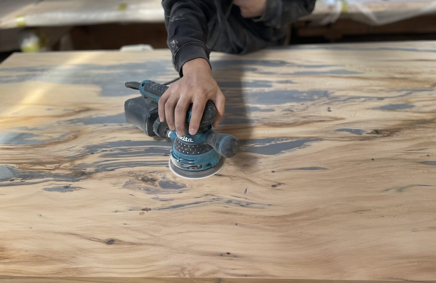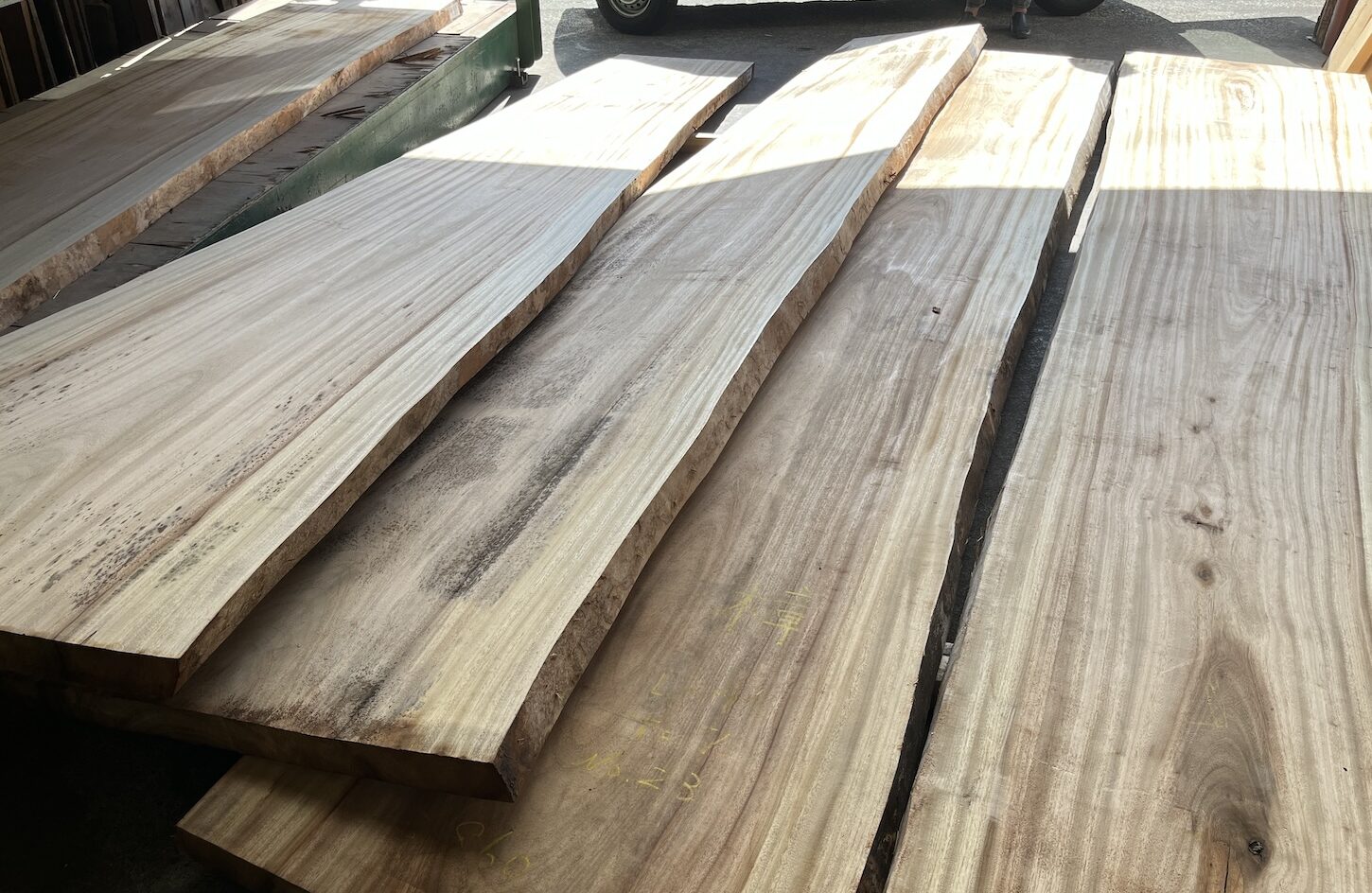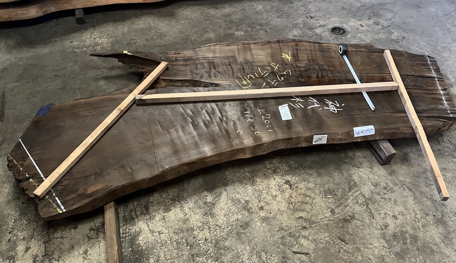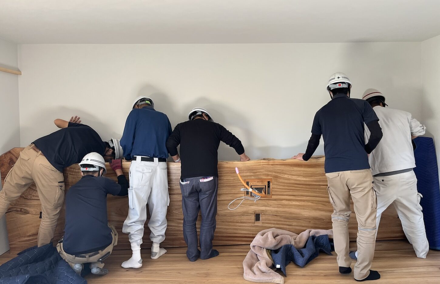 内装は、国産一枚板の床やサウナ付きヒノキ風呂、漆喰壁、ヒノキ天井、神代欅等オリジナルデザイン一枚板家具や照明を製作。